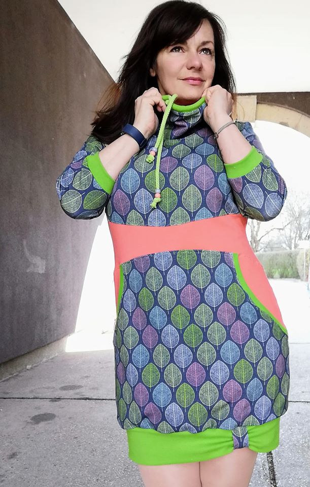 Der Hoodie kann aber auch völlig ohne Teilungen, als Basic inszeniert werden, statt der Kapuze kannst du ihn mit einem Kragen oder nur mit Bündchenabschluss nähen.