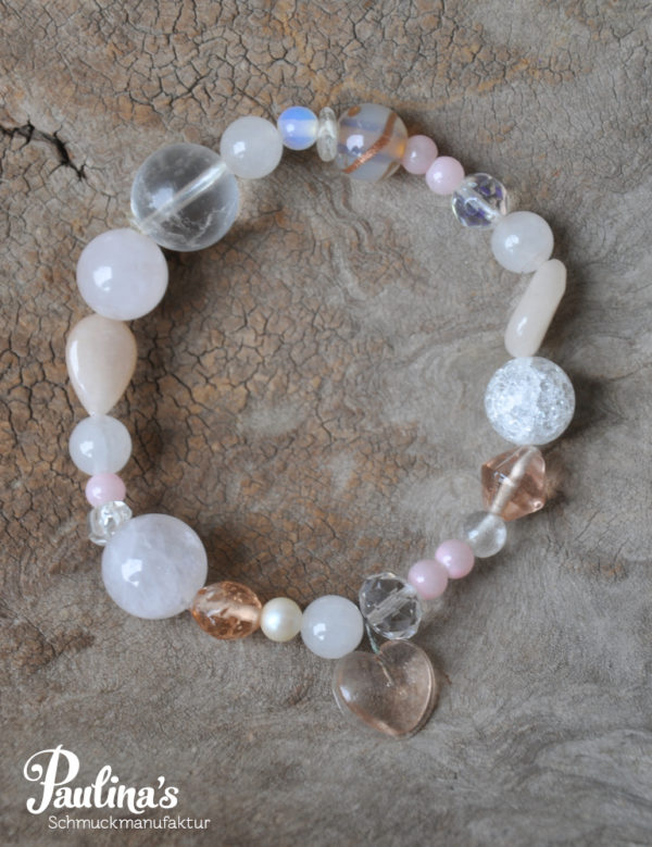 Das Armband besteht aus verschieden Arten von Kugeln und Formen und Materialien.